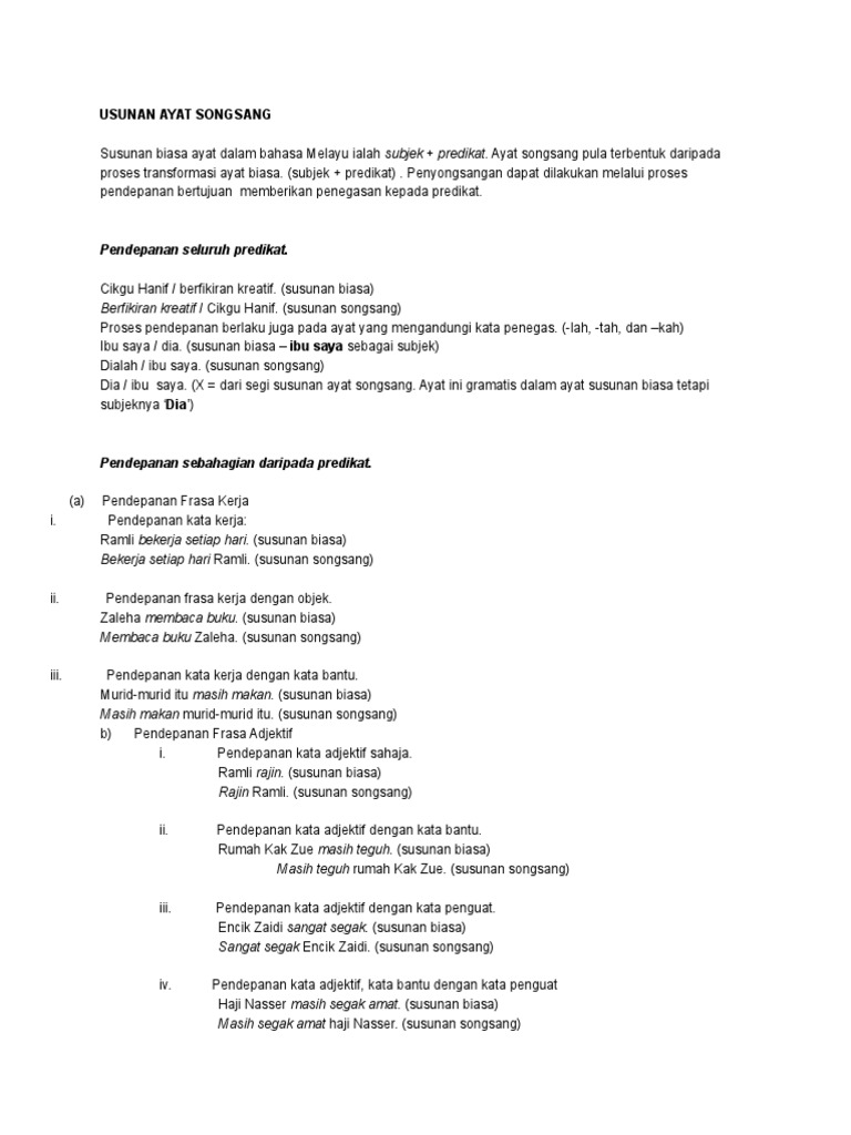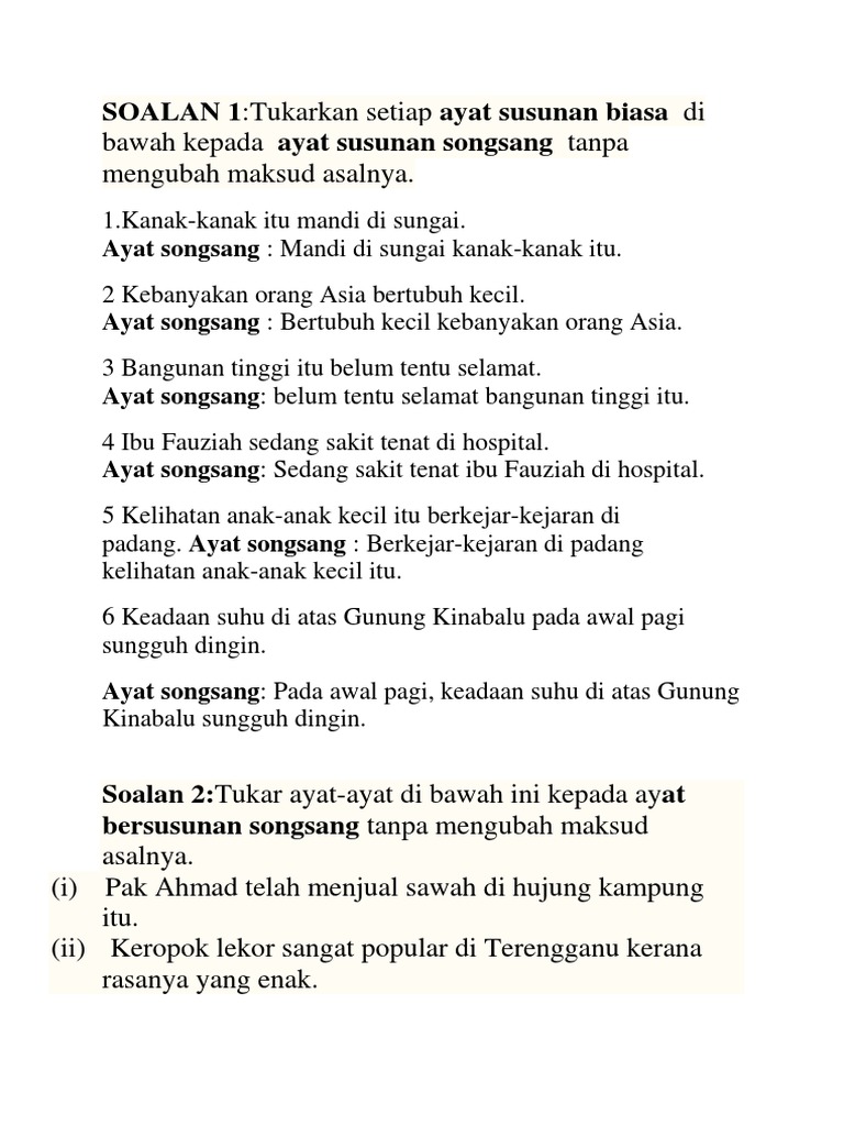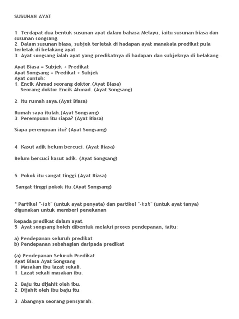Ayat Biasa Ayat Songsang Doc from imgv2-2-f.scribdassets.com Ayat songsang ayat susunan biasa: Ayat biasa dan songsang mempunyai makna yang sama. Dia pergi ke pulau langkawi petang kelmarin. Ayat songsang ayat susunan biasa: Saya ingin juga ke sana. 6 ayat susunan songsang predikat subjek ayat susunan songsang ialah ayat yang telah melalui proses pendepanan predikat. Predikat subjek intonasi ayat konsep ayat songsang; A) ayat susunan biasa b) ayat susunan songsang 4) 5) bapa juliana pergi ke sekolah dengan gembira.