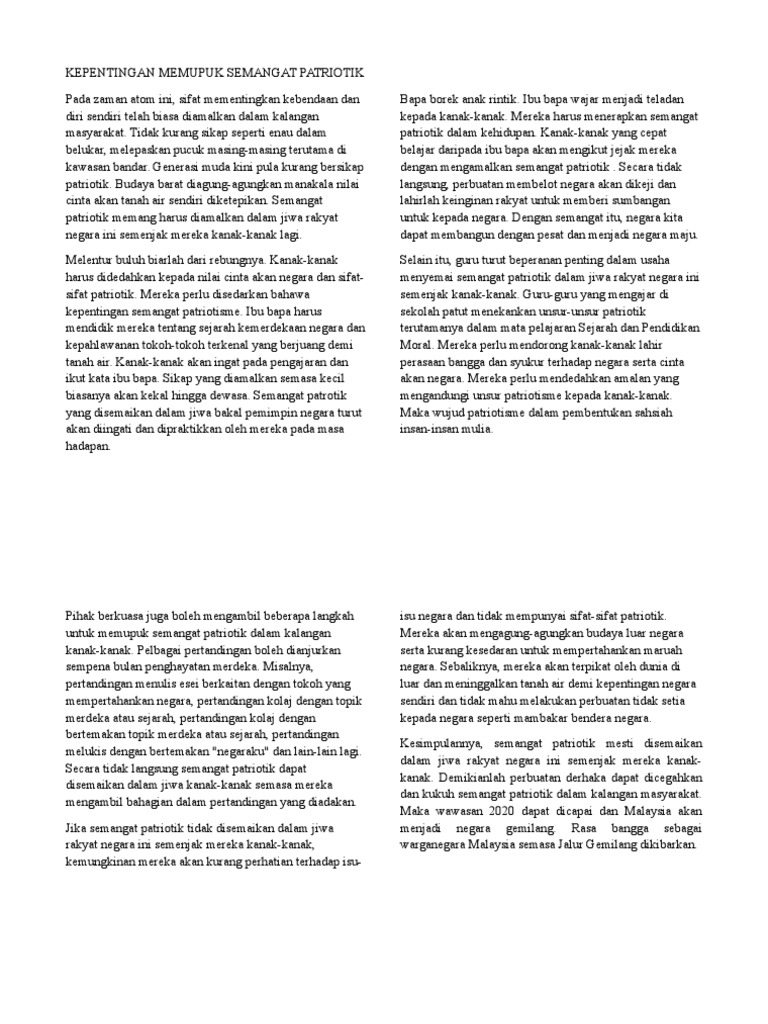 Karangan Semangat Patriotik from imgv2-1-f.scribdassets.com Karangan dibagi menjadi empat yaitu argumentasi. Sebagai seorang remaja, anda juga merupakan seorang belia yang mempunyai peranan penting dalam membangunkan dan memajukan negara ini. Benar atau tidak semua perbuatan yang kalian lakukan hanya hati kecil anda yang bisa merasakan karna sekecil apapun kesalahan maka hatimu akan merasakan bahwa itu salah. Mengapa metode ini sangat dianjurkan kepada para penulis, terutama kepada mereka yang baru mulai menulis? Karena karangan adalah materi yang akan dipelajari semua sekolah. Indonesia adalah negara kepulauan yang terdiri atas berbagai suku bangsa, bahasa, dan agama. Semangat cinta akan negara dan perpaduan : Semangat kebangsaan merujuk sikap cinta akan negara atau nasionalisme yang mendalam terhadap negara yang tercinta.
