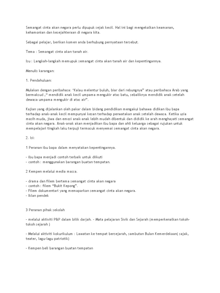 Karangan Cinta Akan Negara - Kerangka karangan ini dibuat dengan bertujuan untuk memudahkan penulis dalam membuat sebuah tulisan.. Mungkin kebanyakan pelajar akan mengetahui tentang hal ini. Contoh karangan bahasa melayu spm peranan remaja dalam membangunkan dan memajukan negara ini. Informasi tentang contoh karangan, karangan adalah sebuah karya tulis yang berbentuk prosa naratif fiktif. Karangan sayangi malaysiaku mempunyai semangat cinta akan negara dan patriotik yang tinggi bersatu padu mempertahankan kemakmuran dalam meniti arus pemodenan yang bertunjangkan nawaitu materialistik dan individualistik ini, semangat cinta akan negara semakin pudar dalam. Patutlah memupuk minat setiap generasi dalam mempelajari bahasa negara kita.
