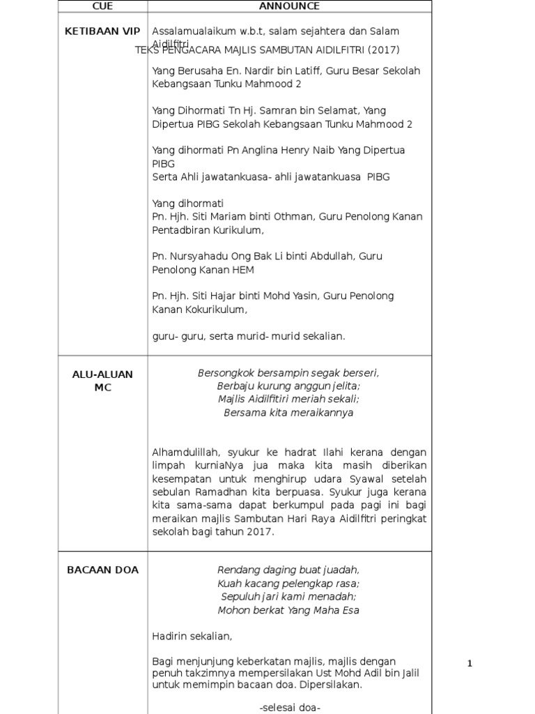 Berikut kami kongsikan bacaan doa sempena majlis sambutan aidilfiri di sekolah. Sebelum majlis menjemput orang yang diraikan, elok kiranya saya bacakan dahulu latar belakang orang yang kita raikan pada hari yang berbahagia ini. Contoh teks pengacara majlis / juruacara majlis. Pihak sekolah mengucapkan jutaan terima kasih kepada semua pihak yang terlibat dalam menjayakan majlis sambutan hari raya peringkat sekolah pada tahun 2017. Juga sesuai diubahsuai untuk program sambutan lain dan juga peringkat daerah serta kebangsaan. Keparengan ing mriki kula badhe matur wontwn ngarsa panjenengan sami, minanagka ketua panitya pengetan tanggap warsa kamardikan ri. Majlis sambutan keamatan & hari raya aidilfitri peringkat sekolah 2019. Kata sambutan ini kebiasaannya disampaikan oleh ketua panitia. Sebelum kita melanjutkan acara berikutnya sambutan pemimpin jamaah sebelum kita memasuki acara inti marilah kita dengarkan sepatah kata. Cikgu2 boleh rehat sehingga jam 10.30 pg. Assalamualaikum w.b.t, salam sejahtera, salam 1 malaysia. Sebagai orang yang berbadan dua, aku terliur tengok kuih raya tu.slurrrppp,huhu. Berikut merupakan salinan bagi teks untuk diberi kepada pengacaran majlis.