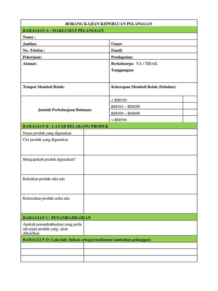 Borang Kajian Keperluan Pelanggan : Kertas Kerja Projek Rbt Tingkatan 3 : Contoh Borang Kajian ... : Kajian kepuasan pelanggan luaran bagi tahun 2021 telah ditutup.. Bersesuaian dengan keperluan belia di kawasan perkampungan masyarakat orang asli. Loyalitas pelanggan secara umum dapat diartikan kesetiaan seseorang atas suatu produk, baik barang maupun jasa tertentu. Isi borang dibawah & dapatkan itinerary percutian secara percuma. Isi borang dibawah & dapatkan itinerary percutian secara percuma. Menghasilkan borang kajian keperluan • mengenal pasti asas teknologi untuk reka pelanggan bentuk produk • memilih dan menjustifikasi teknologi • merancang konsep, elemen dan prinsip reka • menghasilkan lakaran dengan.